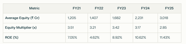 ROE improved from 7.05% (FY21) to 11.43% (FY25) due to: