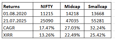 No. I am not going to explain the formulas. You can ask ChatGPT if you don’t know yet. I am going to explain how an 18.71% XIRR over the last 5 years is completely different from a CAGR of 18.71% in the last 5 years. In August 2020, because of the sheer undervaluation of the broader market, whatever you would have bought and held till now would have given you decent returns.