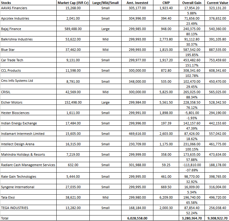Being a boot-strapped founder ever since I graduated, and a recent transition from one organization to another, I have not been able to invest every month in my own stock SIP portfolio because of the unavailability of spare funds. The above is a model portfolio.
