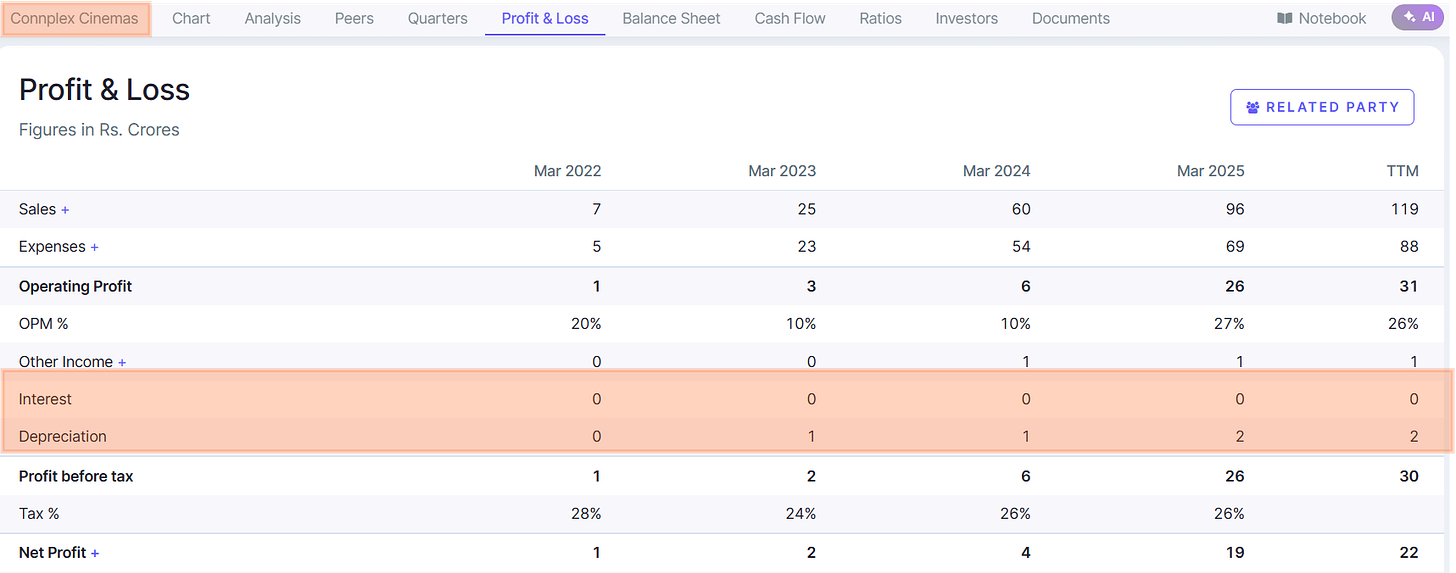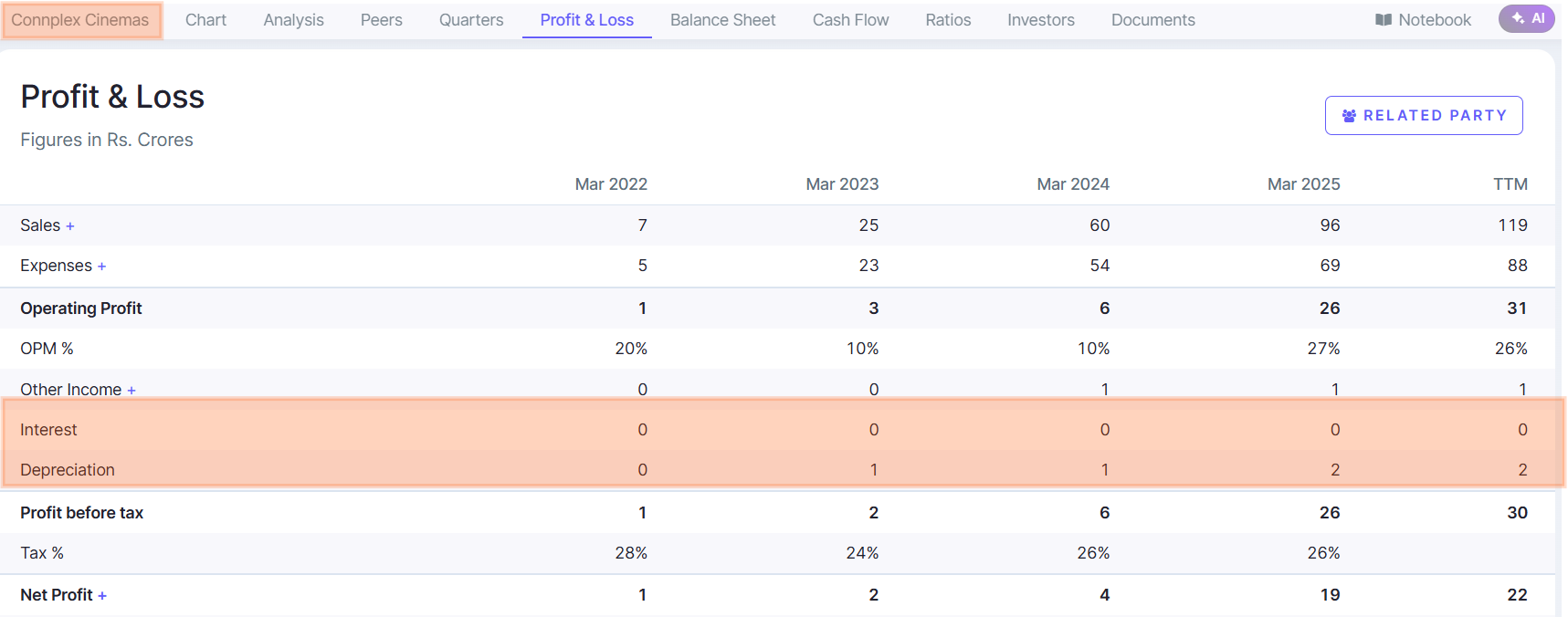 Apart from the fact that PVR INOX is nearly 50 times larger than Connplex in revenue, one detail stands out: both operate with similar average ticket prices, comparable revenue per seat, and nearly identical EBITDA margins. Yet their bottom lines diverge sharply, Connplex earns a 20% PAT margin, while PVR INOX hovers around 1.6%. Why? A quick glance at their P&L statements reveals the answer: depreciation and interest. That’s where the burden of scale shows up, and where the lightness of a capital-efficient model like Connplex quietly wins.
