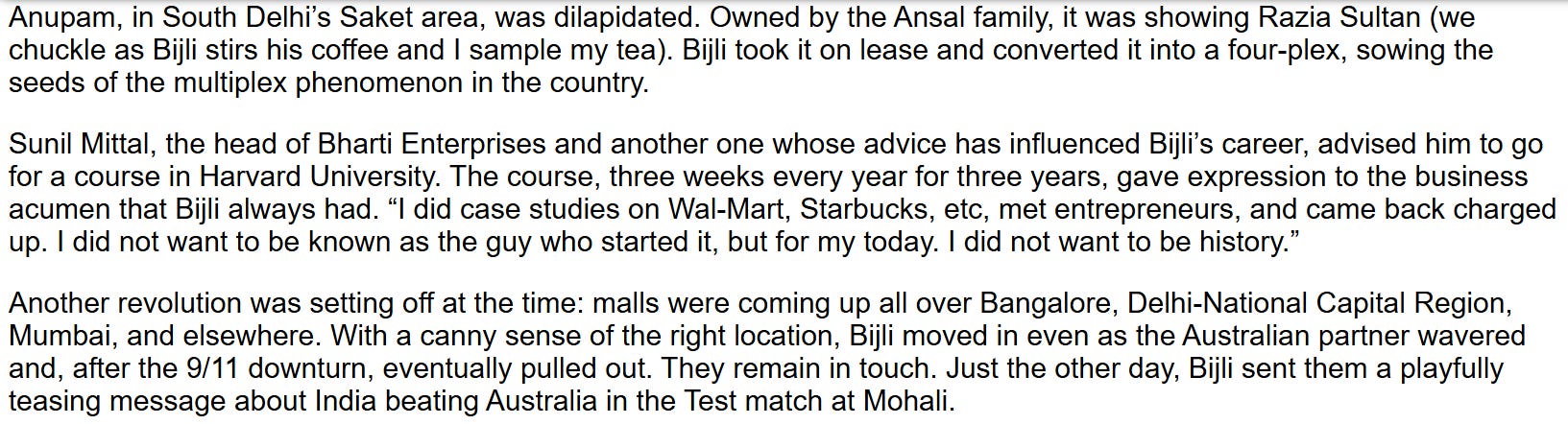 Foreign knowledge, Indian hustle. A familiar combination. By 1997, they opened Anupam in Saket, India’s first multiplex. People like to call it the start of a revolution. Actually, it was just timing. Cities were growing. Malls were coming. Families wanted something cleaner than the old halls. PVR gave them that. That’s how big players are born, not through force, but by being present when the country changes shape.