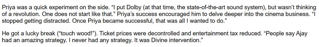 Nothing heroic. Just a man trying to run a cinema. Ajay Bijli renovated Priya Cinema in 1990, and it worked. Luck and divine intervention trump strategy left, right, and centre.So was the case with Ajay Bijli, the founder.