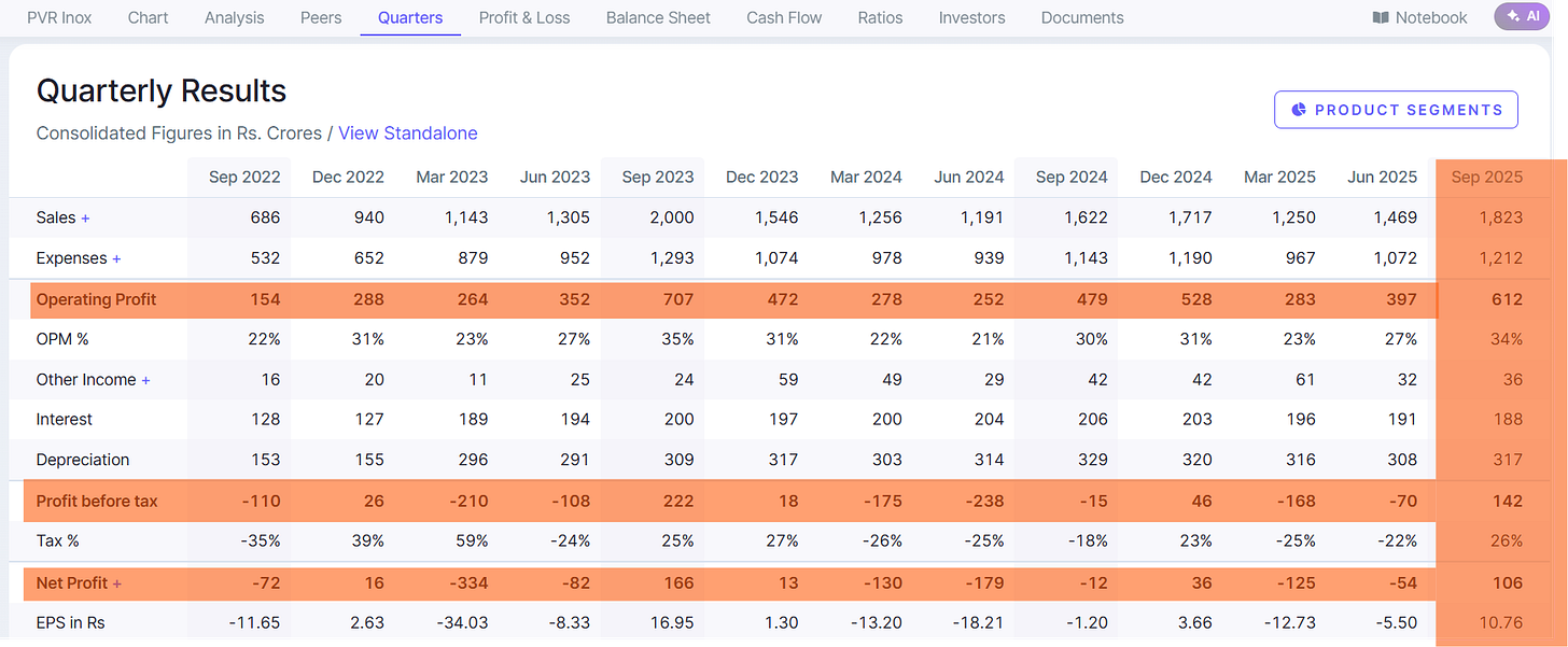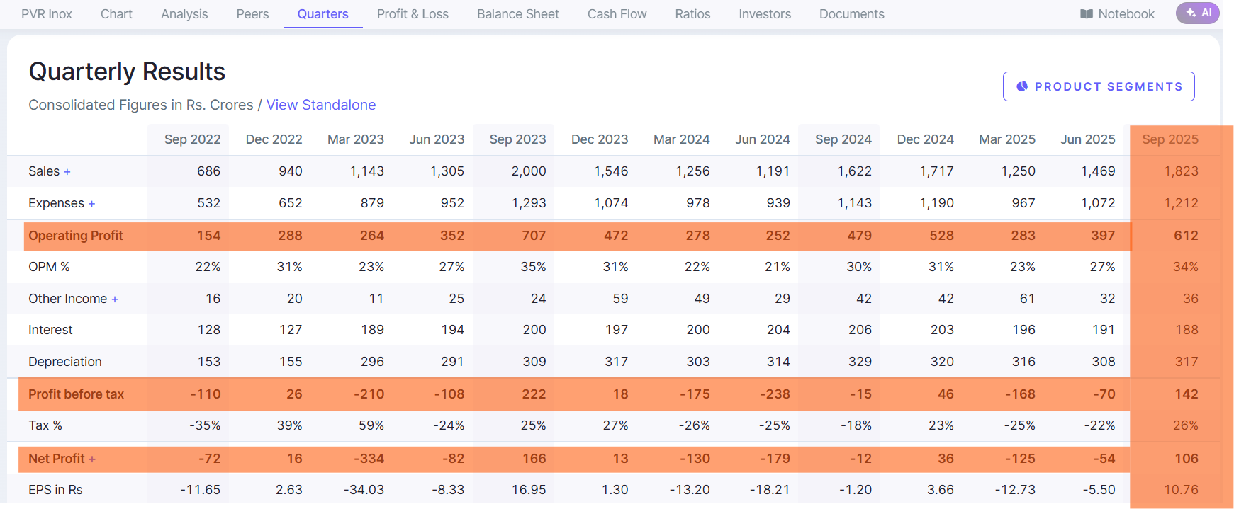 Suddenly, the combined entity has nearly 1,700 screens, 360 cinemas, more than 110 cities, and enough bargaining power to dictate terms to almost everyone around them. But power doesn’t erase fragility. It only postpones it. The merger was logical. But logic does not guarantee ease. FY23 remained messy. FY24 more volatile. FY25 even more unpredictable. One quarter profits, another quarter losses. A strong festival slate could turn things around. A few bad films could break them again. Even in 2025, footfalls rose and fell like monsoon water levels, no stability, just swings. This is the problem with large empires: their results depend on too many things they cannot control.