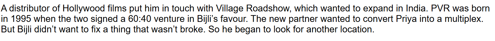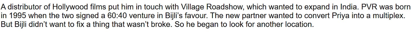 Success in India always attracts partnerships. So in 1995, Village Roadshow came from Australia, and suddenly Priya became Priya Village Roadshow, PVR.