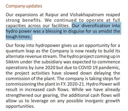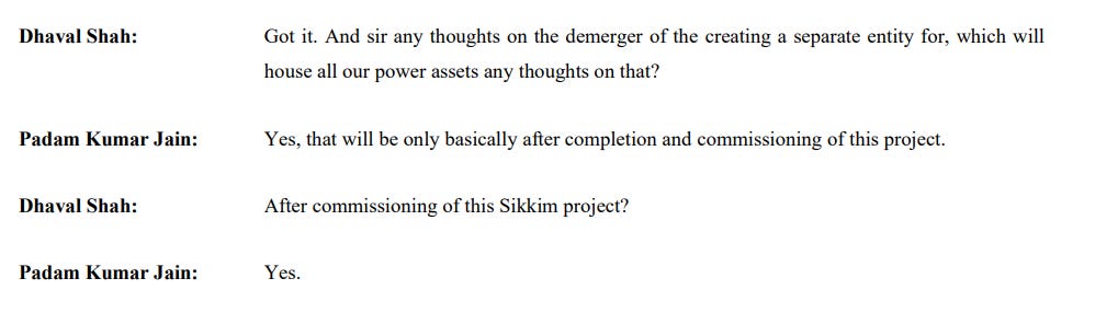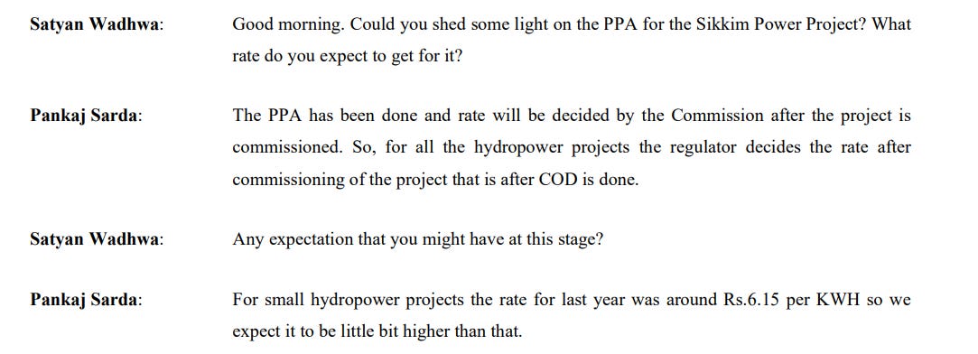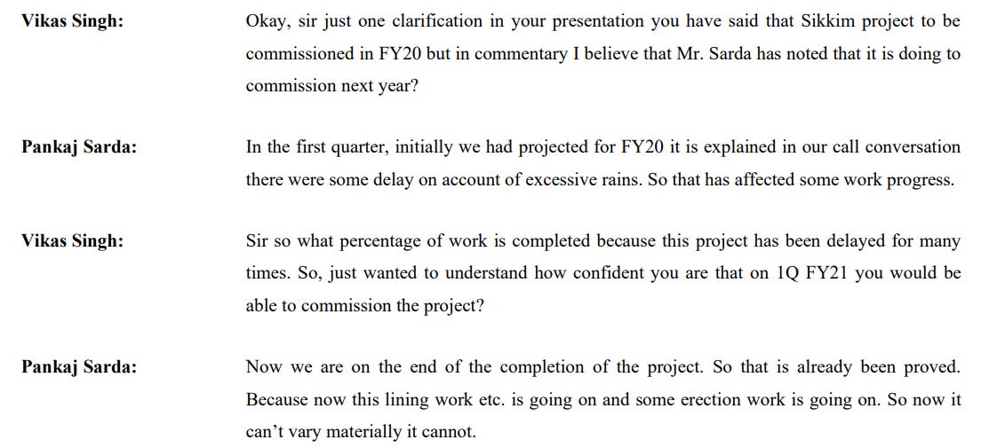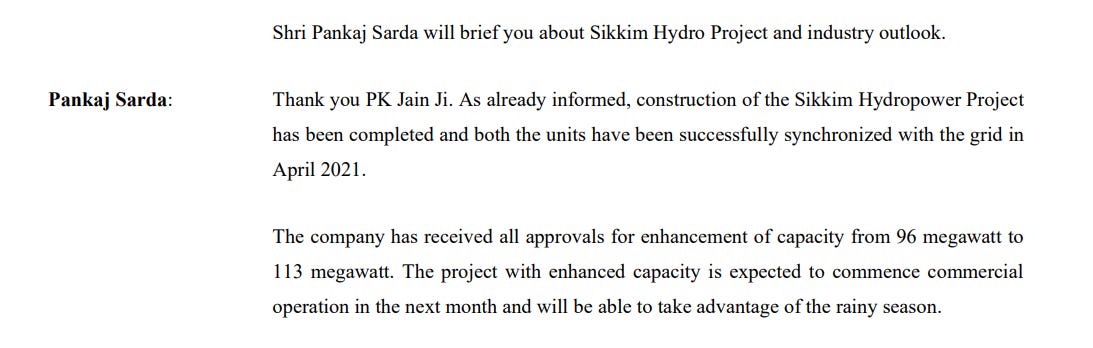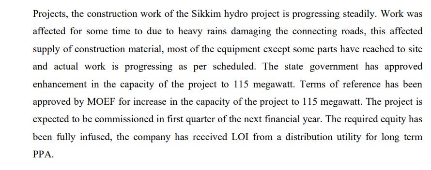 But the real anticipation was for Sikkim. The company had almost finished its 115-megawatt Sikkim hydro project, after years of delays caused by monsoon damage and road blockages. By early 2020, the site was buzzing with final erection work. The entire equity had been infused, long-term PPAs were in place, and commissioning was expected in the first quarter of FY21.