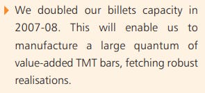 Steel capacity was the first to rise. By 2008, billet production had jumped from 1,40,000 tonnes to 2,40,000 tonnes per year after adding two new induction furnaces.