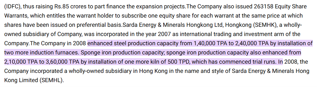 Sponge iron capacity grew from 2,10,000 to 3,60,000 tonnes with a new 500-tonne-per-day kiln.
