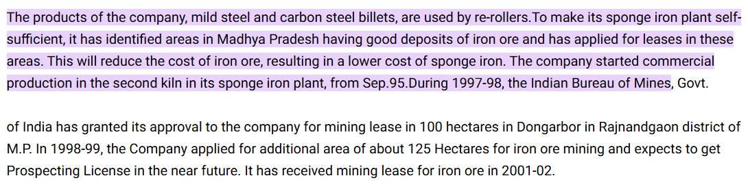 Through the 1990s, the Sardas followed a simple rule: own what matters most. Steelmaking is a business of cycles, and the only way to survive them is to control your inputs. So they began chasing mining rights for iron ore. By 1997–98, they secured a 100-hectare lease in Dongarbore, Rajnandgaon, and soon applied for another 125 hectares nearby. It would take time before mining began, but the intent was clear. The company wanted to make steel from its own ore.