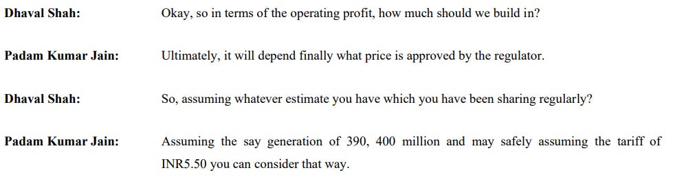 That project, Madhya Bharat Power Corporation, was a milestone. Once operational, it was expected to generate nearly 400 million units annually, translating to an EBITDA of roughly ₹180–200 crore a year. The tariff, expected in the range of ₹5.50 to ₹5.70 per unit, would place it comfortably within the regulated renewable bracket